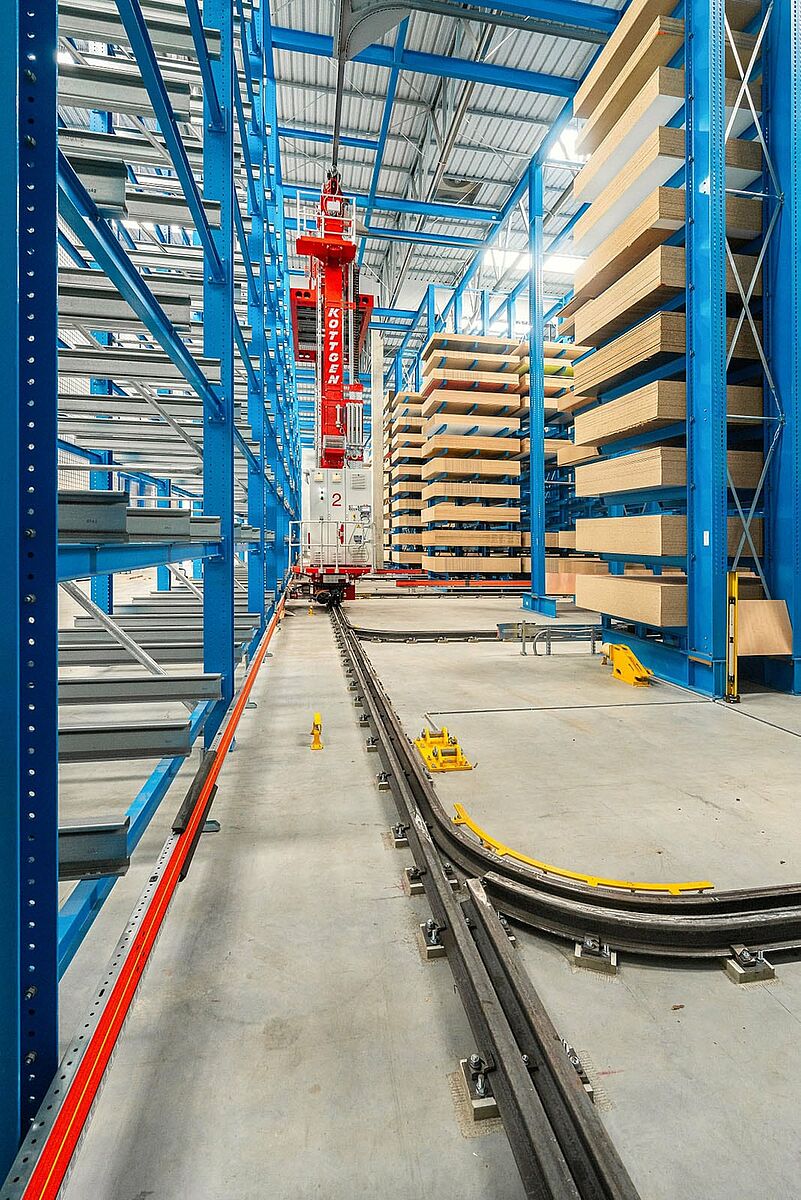 The project was fulfilled by OHRA. The market leader for cantilever racks manufactures all load-bearing elements of its racks from solid hot rolled steel profiles. Therefore, they offer a high load-bearing capacity and a particularly slim design, prerequisites for the high-density storage utilisation in the new 11-metre-high Drevo Trust warehouse. OHRA's many years of experience in the implementation of fully automated wood storage systems also was an advantage. The racking specialist was involved in the design of the warehouse and worked closely together with the Köttgen company, which supplied the storage and retrieval machines. This way, the interfaces between the racking system and operating devices could be precisely coordinated and smooth automatic processes are guaranteed.