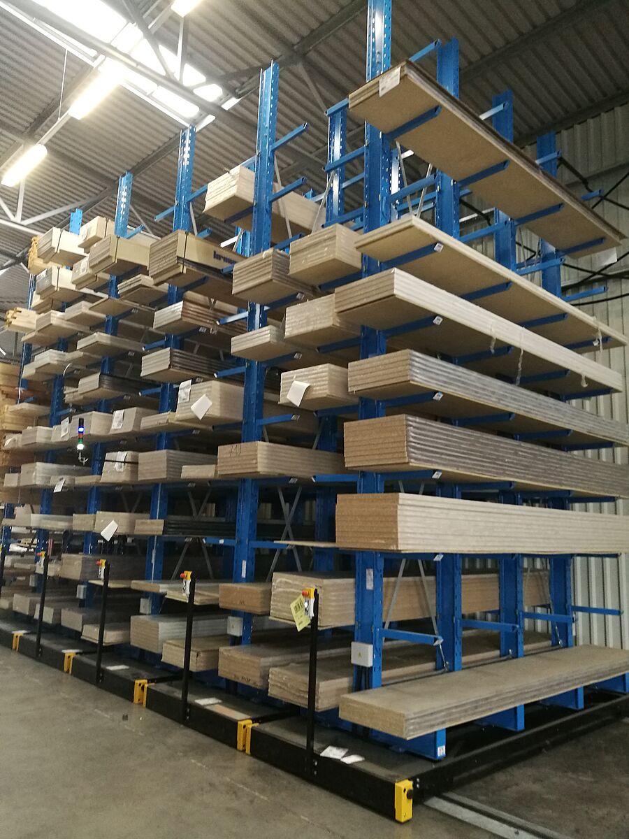 To increase storage space for a wider range of materials, the Greenteam company in Hungary has modernized its warehouse in cooperation with its sister company Nypan with an OHRA cantilever racking system mounted on a carriage. The system, consisting of seven rows of racks, enables the compact storage of over 140 different kitchen worktops on ten levels. Thanks to the mobile racks, not only can Greenteam store more goods in the existing space, but also access the stored articles much faster thanks to the carriages being remotely controlled by the forklift.
