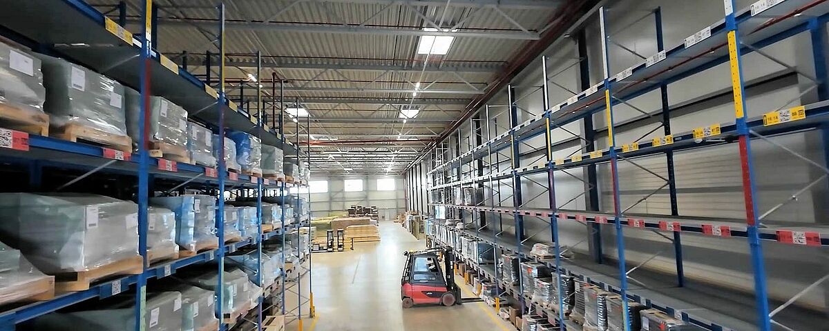 Investing in a new dispatch hall meant Kardex significantly increased it’s storage capacity. The company stores the components and assemblies for its intralogistics systems there before dispatching them to its customers. A total of nine OHRA cantilever racks with a length of up to 48 metres offer sufficient space on four storage levels for the 1,250- to 4,300-millimetre-long packages. Each cantilever can bear up to 1,250 kilograms, and each stand can take up to 3,750 kilograms per side. Using a sideloader means that Kardex was able to keep the aisles between the cantilever arms narrow, achieving high space utilisation. The cantilever racking is supplemented by a standard pallet rack and two double-depth pallet shelves, each with a shelf load of 2,400 kilograms. The double-depth shelves can accommodate packages that are 3.2 metres deep and weigh up to 1.5 tonnes.